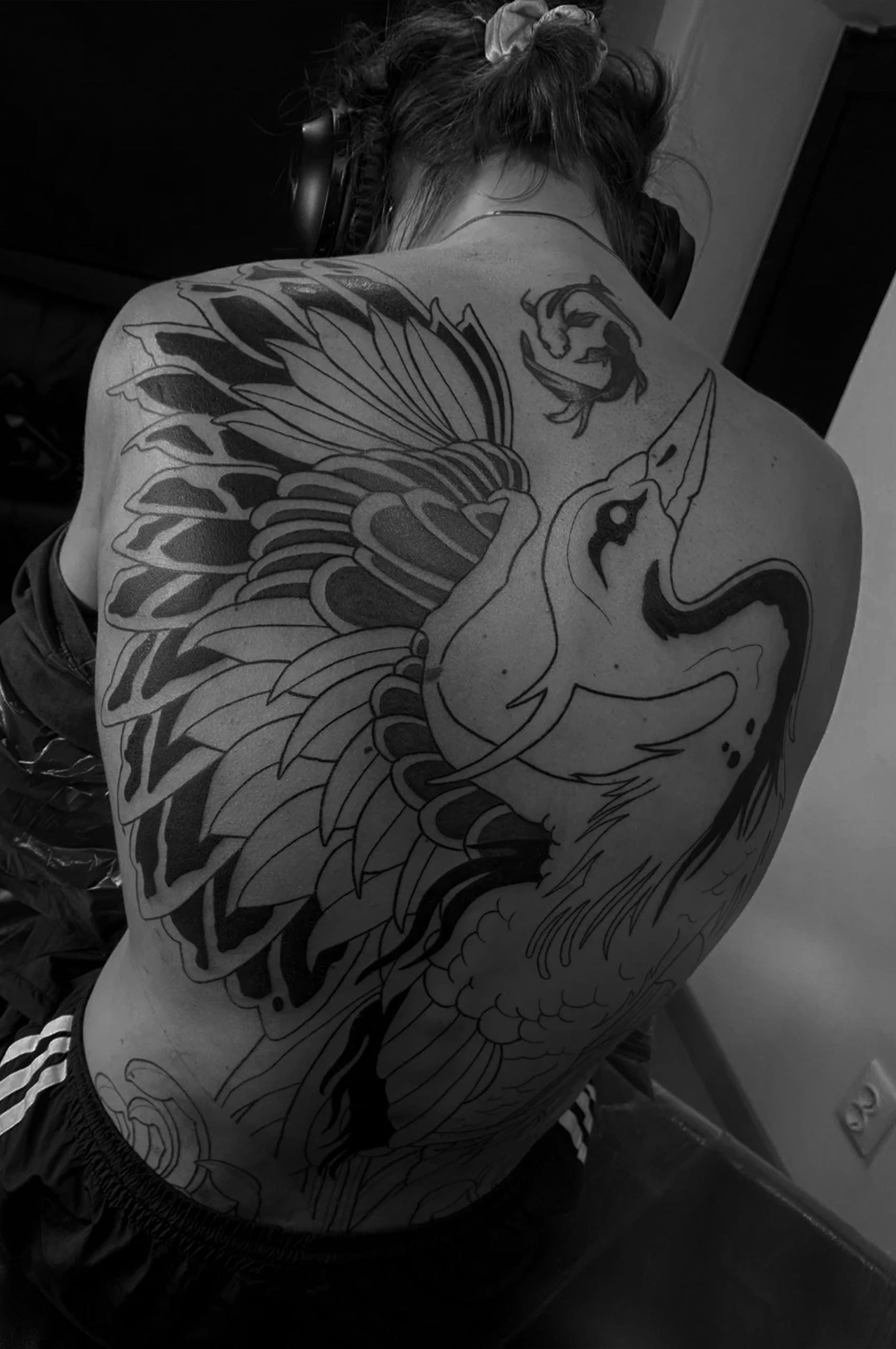 Su formación en pintura le permite crear tatuajes que combinan fuerza visual, equilibrio y narrativa artística, dando como resultado piezas que son tanto impactantes como duraderas.